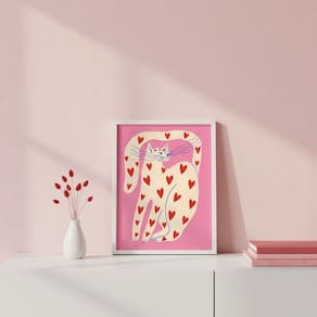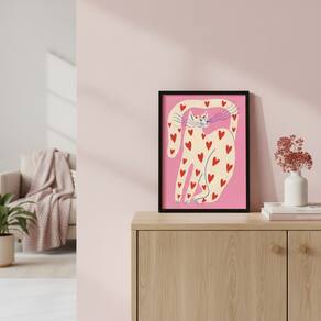 Quadro Gato Rosa e Vermelho - Corações 45x34cm Mold Preta