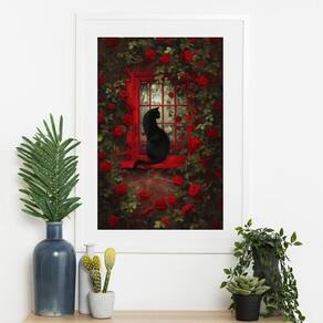 Quadro Gato Rosas Vermelhas - 60X48Cm