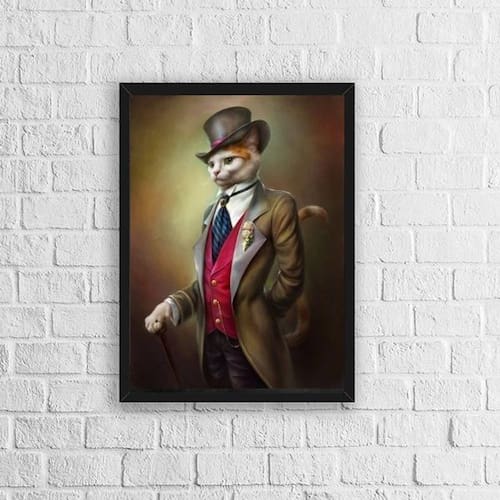 Quadro gato vestido de gente 24x18cm Moldura: madeira preta Informações do produto Decoração para quarto, sala, cozinha, escritório, área gourmet e muito mais. Chega de paredes vazias Medidas - cada peça tem 24x18cm a5 . Material do papel - papel fotográfico brilhante de altíssima resolução Acabamento - todos os quadros são acompanhados de uma película de acetato para proteção da imagem. - os quadros são embalados de forma segura com plástico bolha com camada dupla de acordo com o tamanho dos quadros. - de 3 meses. Meu quadro chegou. Como posso fixá-lo Você precisa apenas de um martelo e um prego, pois os quadros já vão acompanhados de penduradores. Esta é a forma mais indicada. Caso prefira, você pode utilizar uma fita dupla face neste caso, sugerimos de alta qualidade para evitar que descole e seu quadro caia . Como posso limpar meu quadro A limpeza é feita como um móvel comum da sua casa. Apenas um pano seco ou espanador são suficientes para tal Ean: 7891438407782