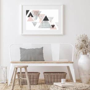 Quadro horizontal triângulos preto rosa cinza- 60x48cm Moldura: madeira preta Informações do produto tire todas as suas dúvidas no descritivo abaixo: decoração para quarto, sala, cozinha, escritório, área gourmet e muito mais. Chega de paredes vazias medidas - cada peça tem 60x48cm . Material do papel - papel fotográfico brilhante de altíssima resolução acabamento - todos os quadros são acompanhados de vidro para proteção da imagem. - moldura em madeira maciça na cor preta ou branca conforme produto escolhido e pendurador. - paspatur branco com 7cm de largura - os quadros são embalados de forma segura com plástico bolha com camada dupla de acordo com o tamanho dos quadros. Garantia - garantia de 3 meses. Meu quadro chegou. Como posso fixá-lo Você precisa apenas de um martelo e um prego, pois os quadros já vão acompanhados de penduradores. Esta é a forma mais indicada. Como posso limpar meu quadro A limpeza é feita como um móvel comum da sua casa. Apenas um pano seco ou espanador são suficientes para tal
