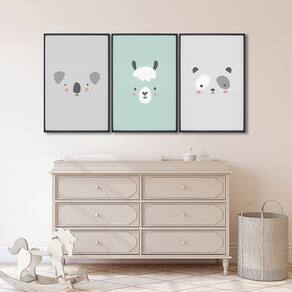 Quadro Infantil Decorativo Rostinhos do Bem Coala Panda Lhama com 3 Telas Cm de Parede para Quarto S Preto