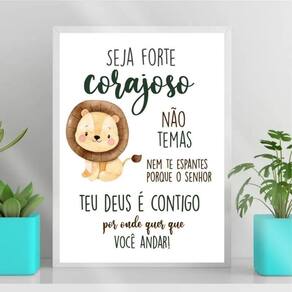 Quadro infantil tema safari seja forte e corajoso 45x34cm Moldura: madeira preta Informações do produto tire todas as suas dúvidas no descritivo abaixo: decoração para quarto, sala, cozinha, escritório, área gourmet e muito mais. Chega de paredes vazias. Medidas - cada peça tem 45x34cm a3 . Material do papel - papel fotográfico brilhante de altíssima resolução acabamento - todos os quadros são acompanhados de uma película de acetato para proteção da imagem. - os quadros são embalados de forma segura com plástico bolha com camada dupla de acordo com o tamanho dos quadros. - de 3 meses. Meu quadro chegou. Como posso fixá-lo Você precisa apenas de um martelo e um prego, pois os quadros já vão acompanhados de penduradores. Esta é a forma mais indicada. Caso prefira, você pode utilizar uma fita dupla face neste caso, sugerimos de alta qualidade para evitar que descole e seu quadro caia . Como posso limpar meu quadro A limpeza é feita como um móvel comum da sua casa. Apenas um pano seco ou espanador são suficientes para tal