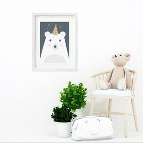 Quadro infantil urso branco e cinza - 60x48cm Moldura: madeira preta Informações do produto tire todas as suas dúvidas no descritivo abaixo: decoração para quarto, sala, cozinha, escritório, área gourmet e muito mais. Chega de paredes vazias medidas - cada peça tem 60x48cm . Material do papel - papel fotográfico brilhante de altíssima resolução acabamento - todos os quadros são acompanhados de vidro para proteção da imagem. - moldura em madeira maciça na cor preta ou branca conforme produto escolhido e pendurador. - paspatur branco com 7cm de largura - os quadros são embalados de forma segura com plástico bolha com camada dupla de acordo com o tamanho dos quadros. Garantia - garantia de 3 meses. Meu quadro chegou. Como posso fixá-lo Você precisa apenas de um martelo e um prego, pois os quadros já vão acompanhados de penduradores. Esta é a forma mais indicada. Como posso limpar meu quadro A limpeza é feita como um móvel comum da sua casa. Apenas um pano seco ou espanador são suficientes para tal