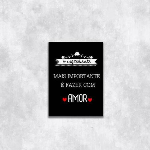 Quadro ingrediente mais importante é o amor 24x18cm Moldura: madeira preta Informações do produto tire todas as suas dúvidas no descritivo abaixo: decoração para quarto, sala, cozinha, escritório, área gourmet e muito mais. Chega de paredes vazias medidas - cada peça tem 24x18cm a5 . Material do papel - papel fotográfico brilhante de altíssima resolução acabamento - todos os quadros são acompanhados de uma película de acetato para proteção da imagem. - moldura em madeira maciça na cor branca e pendurador móvel que pode ser retirado facilmente caso deseje fixar com fita dupla face. - os quadros são embalados de forma segura com plástico bolha com camada dupla de acordo com o tamanho dos quadros. - de 3 meses prazo de envio pedimos 24 horas úteis no máximo para enviar seu pedido após o envio, segue os prazos normais dos correios, cerca de 7 exceto para norte e nordeste, que pode ser de até 14 . Em diversas cidades, este prazo normalmente é reduzido, mas depende do prazo dos correios. Meu quadro chegou. Como posso fixá-lo Você precisa apenas de um martelo e um prego, pois os quadros já vão acompanhados de penduradores. Esta é a forma mais indicada. Caso prefira, você pode utilizar uma fita dupla face neste caso, sugerimos de alta qualidade para evitar que descole e seu quadro caia . Como posso limpar meu quadro A limpeza é feita como um móvel comum da sua casa. Apenas um pano seco ou espanador são suficientes para tal Marca: Não Informado