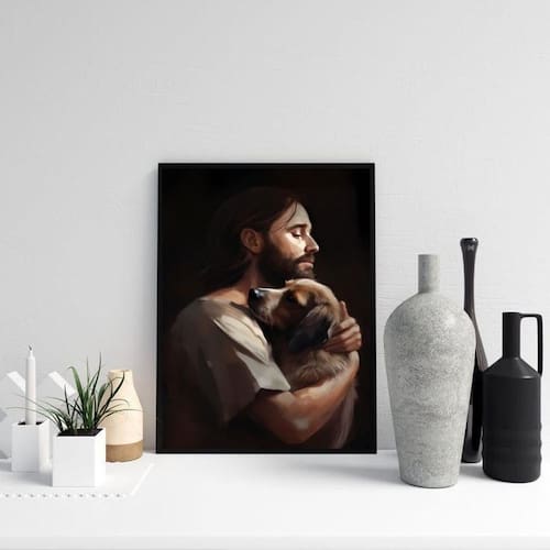 Quadro jesus abraçando cachorro 24x18cm - com vidro Moldura: madeira preta Informações do produto tire todas as suas dúvidas no descritivo abaixo: decoração para quarto, sala, cozinha, escritório, área gourmet e muito mais. Chega de paredes vazias medidas - cada peça tem 24x18cm a5 . Material do papel - papel fotográfico brilhante de altíssima resolução acabamento - todos os quadros são acompanhados de vidro para proteção da imagem. - moldura em madeira maciça na cor preta ou branca conforme produto escolhido e pendurador . - os quadros são embalados de forma segura com plástico bolha com camada dupla de acordo com o tamanho dos quadros. Garantia - garantia de 3 meses. Meu quadro chegou. Como posso fixá-lo Você precisa apenas de um martelo e um prego, pois os quadros já vão acompanhados de penduradores. Esta é a forma mais indicada. Como posso limpar meu quadro A limpeza é feita como um móvel comum da sua casa. Apenas um pano seco ou espanador são suficientes para tal