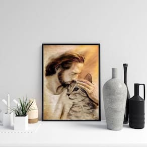 Quadro jesus acolhendo gatinho 24x18cm - com vidro Moldura: madeira preta Informações do produto tire todas as suas dúvidas no descritivo abaixo: decoração para quarto, sala, cozinha, escritório, área gourmet e muito mais. Chega de paredes vazias medidas - cada peça tem 24x18cm a5 . Material do papel - papel fotográfico brilhante de altíssima resolução acabamento - todos os quadros são acompanhados de vidro para proteção da imagem. - moldura em madeira maciça na cor preta ou branca conforme produto escolhido e pendurador . - os quadros são embalados de forma segura com plástico bolha com camada dupla de acordo com o tamanho dos quadros. Garantia - garantia de 3 meses. Meu quadro chegou. Como posso fixá-lo Você precisa apenas de um martelo e um prego, pois os quadros já vão acompanhados de penduradores. Esta é a forma mais indicada. Como posso limpar meu quadro A limpeza é feita como um móvel comum da sua casa. Apenas um pano seco ou espanador são suficientes para tal