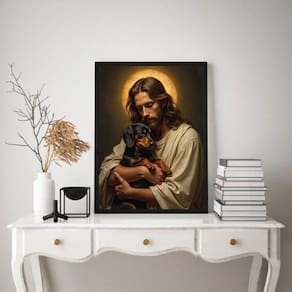 Quadro jesus com cão dachshund no colo 45x34cm - com vidro Cor: moldura preta Informações do produto tire todas as suas dúvidas no descritivo abaixo: decoração para quarto, sala, cozinha, escritório, área gourmet e muito mais. Chega de paredes vazias medidas - cada peça tem 45x34cm a3 . Material do papel - papel fotográfico brilhante de altíssima resolução acabamento - todos os quadros são acompanhados de vidro para proteção da imagem. - moldura em madeira maciça na cor preta ou branca conforme produto escolhido e pendurador . - os quadros são embalados de forma segura com plástico bolha com camada dupla de acordo com o tamanho dos quadros. - de 3 meses. Meu quadro chegou. Como posso fixá-lo Você precisa apenas de um martelo e um prego, pois os quadros já vão acompanhados de penduradores. Esta é a forma mais indicada. Como posso limpar meu quadro A limpeza é feita como um móvel comum da sua casa. Apenas um pano seco ou espanador são suficientes para tal Marca: Não Informado Ean: 7901039743704