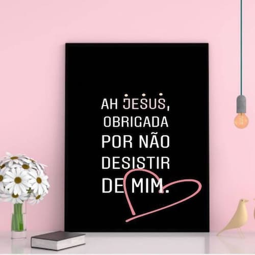 Quadro jesus obrigada por não desistir 45x34cm Moldura: madeira preta Informações do produto tire todas as suas dúvidas no descritivo abaixo: decoração para quarto, sala, cozinha, escritório, área gourmet e muito mais. Chega de paredes vazias medidas - cada peça tem 45x34cm a3 . Material do papel - papel fotográfico brilhante de altíssima resolução acabamento - todos os quadros são acompanhados de uma película de acetato para proteção da imagem. - moldura em madeira maciça na cor preta e pendurador móvel que pode ser retirado facilmente caso deseje fixar com fita dupla face. - os quadros são embalados de forma segura com plástico bolha com camada dupla de acordo com o tamanho dos quadros. - de 3 meses. Meu quadro chegou. Como posso fixá-lo Você precisa apenas de um martelo e um prego, pois os quadros já vão acompanhados de penduradores. Esta é a forma mais indicada. Caso prefira, você pode utilizar uma fita dupla face neste caso, sugerimos de alta qualidade para evitar que descole e seu quadro caia . Como posso limpar meu quadro A limpeza é feita como um móvel comum da sua casa. Apenas um pano seco ou espanador são suficientes para tal