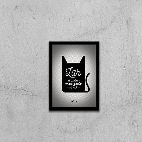 Quadro lar é onde meu gato está 24x18cm Moldura: madeira preta Informações do produto tire todas as suas dúvidas no descritivo abaixo: decoração para quarto, sala, cozinha, escritório, área gourmet e muito mais. Chega de paredes vazias medidas - cada peça tem 24x18cm a5 . Material do papel - papel fotográfico brilhante de altíssima resolução acabamento - todos os quadros são acompanhados de uma película de acetato para proteção da imagem. - moldura em madeira maciça na cor branca e pendurador móvel que pode ser retirado facilmente caso deseje fixar com fita dupla face. - os quadros são embalados de forma segura com plástico bolha com camada dupla de acordo com o tamanho dos quadros. - de 3 meses prazo de envio pedimos 24 horas úteis no máximo para enviar seu pedido após o envio, segue os prazos normais dos correios, cerca de 7 exceto para norte e nordeste, que pode ser de até 14 . Em diversas cidades, este prazo normalmente é reduzido, mas depende do prazo dos correios. Meu quadro chegou. Como posso fixá-lo Você precisa apenas de um martelo e um prego, pois os quadros já vão acompanhados de penduradores. Esta é a forma mais indicada. Caso prefira, você pode utilizar uma fita dupla face neste caso, sugerimos de alta qualidade para evitar que descole e seu quadro caia . Como posso limpar meu quadro A limpeza é feita como um móvel comum da sua casa. Apenas um pano seco ou espanador são suficientes para tal Marca: Não Informado