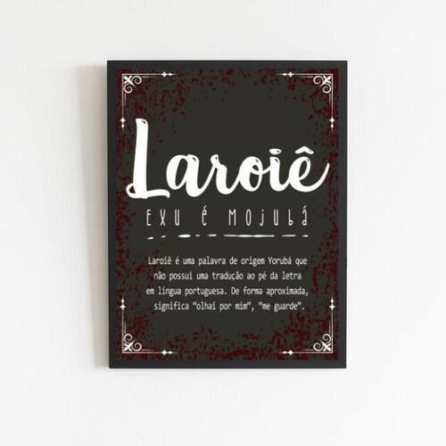 Quadro laroiê significado 45x34cm Moldura: madeira preta Informações do produto tire todas as suas dúvidas no descritivo abaixo: decoração para quarto, sala, cozinha, escritório, área gourmet e muito mais. Chega de paredes vazias. Medidas - cada peça tem 45x34cm a3 . Material do papel - papel fotográfico brilhante de altíssima resolução acabamento - todos os quadros são acompanhados de uma película de acetato para proteção da imagem. - moldura em madeira maciça na cor preta e pendurador móvel que pode ser retirado facilmente caso deseje fixar com fita dupla face. - os quadros são embalados de forma segura com plástico bolha com camada dupla de acordo com o tamanho dos quadros. Garantia - garantia de 3 meses. Meu quadro chegou. Como posso fixá-lo Você precisa apenas de um martelo e um prego, pois os quadros já vão acompanhados de penduradores. Esta é a forma mais indicada. Caso prefira, você pode utilizar uma fita dupla face neste caso, sugerimos de alta qualidade para evitar que descole e seu quadro caia . Como posso limpar meu quadro A limpeza é feita como um móvel comum da sua casa. Apenas um pano seco ou espanador são suficientes para tal