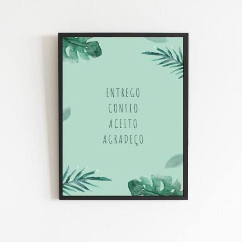 Quadro mantra entrego aceito confio agradeço 24x18cm - com vidro Moldura: madeira preta Informações do produto Decoração para quarto, sala, cozinha, escritório, área gourmet e muito mais. Chega de paredes vazias medidas - cada peça tem 24x18cm a5 .Material do papel - papel fotográfico brilhante de altíssima resolução Acabamento - todos os quadros são acompanhados de vidro para proteção da imagem.- moldura em madeira maciça e pendurador . - os quadros são embalados de forma segura com plástico bolha com camada dupla de acordo com o tamanho dos quadrosGarantia - garantia de 3 meses. Meu quadro chegou. Como posso fixá-lo Você precisa apenas de um martelo e um prego, pois os quadros já vão acompanhados de penduradores. Esta é a forma mais indicada. Como posso limpar meu quadro A limpeza é feita como um móvel comum da sua casa. Apenas um pano seco ou espanador são suficientes para tal