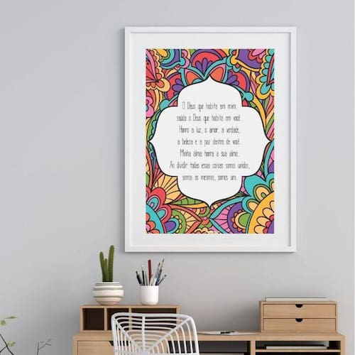 Quadro mantra o deus que habita em mim - 60x48cm Moldura: madeira preta Informações do produto tire todas as suas dúvidas no descritivo abaixo: decoração para quarto, sala, cozinha, escritório, área gourmet e muito mais. Chega de paredes vazias medidas - cada peça tem 60x48cm . Material do papel - papel fotográfico brilhante de altíssima resolução acabamento - todos os quadros são acompanhados de vidro para proteção da imagem. - moldura em madeira maciça na cor preta ou branca conforme produto escolhido e pendurador. - paspatur branco com 7cm de largura - os quadros são embalados de forma segura com plástico bolha com camada dupla de acordo com o tamanho dos quadros. Garantia - garantia de 3 meses. Meu quadro chegou. Como posso fixá-lo Você precisa apenas de um martelo e um prego, pois os quadros já vão acompanhados de penduradores. Esta é a forma mais indicada. Como posso limpar meu quadro A limpeza é feita como um móvel comum da sua casa. Apenas um pano seco ou espanador são suficientes para tal Ean: 7893776527559