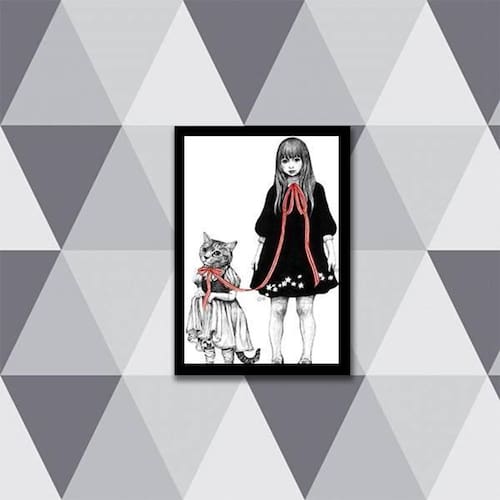 Quadro Menina Com Gatinho 33X24Cm - Com Vidro Moldura Preta