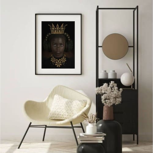 Quadro Menina Negra Fone Ouvido - 60x48cm - Moldura: Madeira preta