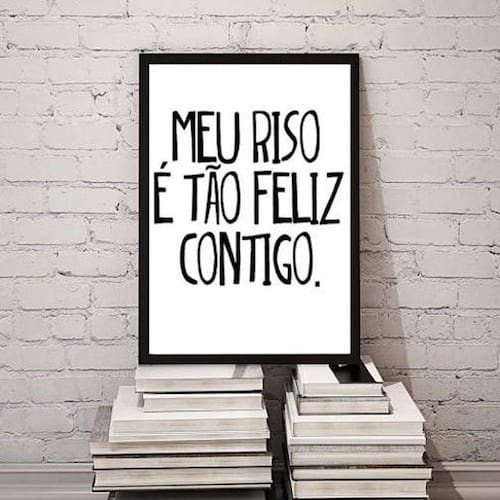 Quadro meu riso é tão feliz contigo 33x24cm - com vidro Moldura: madeira preta Informações do produto tire todas as suas dúvidas no descritivo abaixo: decoração para quarto, sala, cozinha, escritório, área gourmet e muito mais. Chega de paredes vazias medidas - cada peça tem 33x24cm a4 . Material do papel - papel fotográfico brilhante de altíssima resolução acabamento - todos os quadros são acompanhados de vidro para proteção da imagem. - moldura em madeira maciça na cor preta ou branca conforme produto escolhido e pendurador . - os quadros são embalados de forma segura com plástico bolha com camada dupla de acordo com o tamanho dos quadros. Garantia - garantia de 3 meses. Meu quadro chegou. Como posso fixá-lo Você precisa apenas de um martelo e um prego, pois os quadros já vão acompanhados de penduradores. Esta é a forma mais indicada. Como posso limpar meu quadro A limpeza é feita como um móvel comum da sua casa. Apenas um pano seco ou espanador são suficientes para tal Ean: 7894897090533