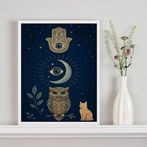 Quadro mistico hamsa lua coruja gato 45x34cm Cor: moldura preta Informações do produto tire todas as suas dúvidas no descritivo abaixo: decoração para quarto, sala, cozinha, escritório, área gourmet e muito mais. Chega de paredes vazias. Medidas - cada peça tem 45x34cm a3 . Material do papel - papel fotográfico brilhante de altíssima resolução acabamento - todos os quadros são acompanhados de uma película de acetato para proteção da imagem. - os quadros são embalados de forma segura com plástico bolha com camada dupla de acordo com o tamanho dos quadros. - de 3 meses. Meu quadro chegou. Como posso fixá-lo Você precisa apenas de um martelo e um prego, pois os quadros já vão acompanhados de penduradores. Esta é a forma mais indicada. Caso prefira, você pode utilizar uma fita dupla face neste caso, sugerimos de alta qualidade para evitar que descole e seu quadro caia . Como posso limpar meu quadro A limpeza é feita como um móvel comum da sua casa. Apenas um pano seco ou espanador são suficientes para tal