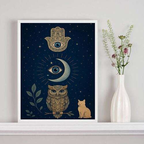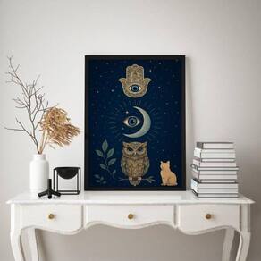 Quadro mistico hamsa lua coruja gato 45x34cm Cor: moldura branca Informações do produto tire todas as suas dúvidas no descritivo abaixo: decoração para quarto, sala, cozinha, escritório, área gourmet e muito mais. Chega de paredes vazias. Medidas - cada peça tem 45x34cm a3 . Material do papel - papel fotográfico brilhante de altíssima resolução acabamento - todos os quadros são acompanhados de uma película de acetato para proteção da imagem. - os quadros são embalados de forma segura com plástico bolha com camada dupla de acordo com o tamanho dos quadros. - de 3 meses. Meu quadro chegou. Como posso fixá-lo Você precisa apenas de um martelo e um prego, pois os quadros já vão acompanhados de penduradores. Esta é a forma mais indicada. Caso prefira, você pode utilizar uma fita dupla face neste caso, sugerimos de alta qualidade para evitar que descole e seu quadro caia . Como posso limpar meu quadro A limpeza é feita como um móvel comum da sua casa. Apenas um pano seco ou espanador são suficientes para tal Marca: Não Informado