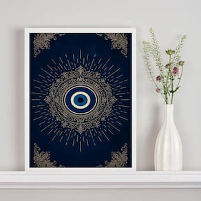 Quadro mistico mandala olho grego - azul dourado 33x24cm - com vidro Cor: moldura branca Informações do produto tire todas as suas dúvidas no descritivo abaixo: decoração para quarto, sala, cozinha, escritório, área gourmet e muito mais. Chega de paredes vazias medidas - cada peça tem 33x24cm a4 . Material do papel - papel fotográfico brilhante de altíssima resolução acabamento - todos os quadros são acompanhados de vidro para proteção da imagem. - moldura em madeira maciça na cor preta ou branca conforme produto escolhido e pendurador . - os quadros são embalados de forma segura com plástico bolha com camada dupla de acordo com o tamanho dos quadros. - de 3 meses. Meu quadro chegou. Como posso fixá-lo Você precisa apenas de um martelo e um prego, pois os quadros já vão acompanhados de penduradores. Esta é a forma mais indicada. Como posso limpar meu quadro A limpeza é feita como um móvel comum da sua casa. Apenas um pano seco ou espanador são suficientes para tal