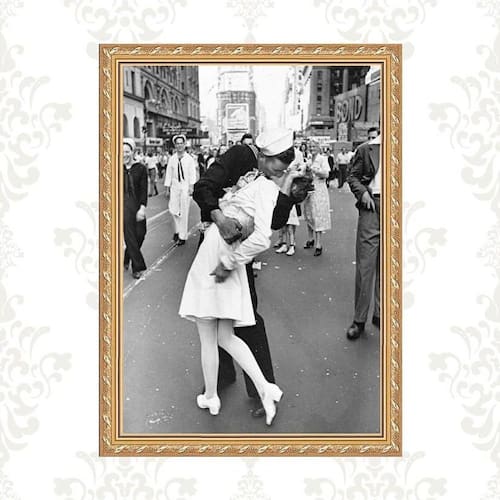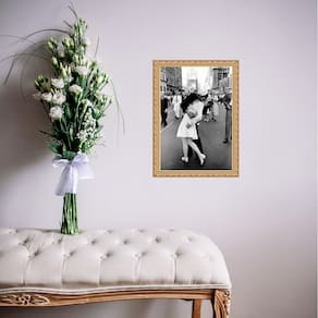 Quadro moldura dourada beijo segunda guerra 33x24cm Acabamento: com acetato Informações do produto tire todas as suas dúvidas no descritivo abaixo: decoração para quarto, sala, cozinha, escritório, área gourmet e muito mais. Chega de paredes vazias medidas - cada peça tem 33x24cm a4 . Material do papel - papel fotográfico brilhante de altíssima resolução acabamento - todos os quadros são acompanhados de vidro ou uma película de acetato para proteção da imagem conforme escolha . - os quadros são embalados de forma segura com plástico bolha com camada dupla de acordo com o tamanho dos quadros. Garantia - garantia de 3 meses. Meu quadro chegou. Como posso fixá-lo Você precisa apenas de um martelo e um prego, pois os quadros já vão acompanhados de penduradores. Esta é a forma mais indicada. Caso prefira, você pode utilizar uma fita dupla face neste caso, sugerimos de alta qualidade para evitar que descole e seu quadro caia . Como posso limpar meu quadro A limpeza é feita como um móvel comum da sua casa. Apenas um pano seco ou espanador são suficientes para tal