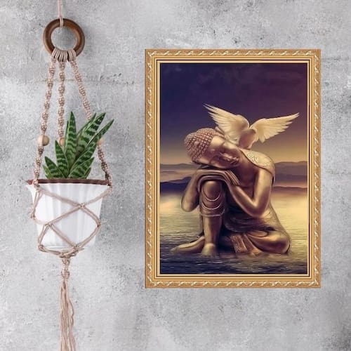 Quadro moldura dourada buda com pomba da paz 24x18cm Acabamento: com vidro Informações do produto tire todas as suas dúvidas no descritivo abaixo: decoração para quarto, sala, cozinha, escritório, área gourmet e muito mais. Chega de paredes vazias medidas - cada peça tem 24x18cm a5 . Material do papel - papel fotográfico brilhante de altíssima resolução acabamento - todos os quadros são acompanhados de vidro ou uma película de acetato para proteção da imagem conforme escolha . - os quadros são embalados de forma segura com plástico bolha com camada dupla de acordo com o tamanho dos quadros. Garantia - garantia de 3 meses. Meu quadro chegou. Como posso fixá-lo Você precisa apenas de um martelo e um prego, pois os quadros já vão acompanhados de penduradores. Esta é a forma mais indicada. Caso prefira, você pode utilizar uma fita dupla face neste caso, sugerimos de alta qualidade para evitar que descole e seu quadro caia . Como posso limpar meu quadro A limpeza é feita como um móvel comum da sua casa. Apenas um pano seco ou espanador são suficientes para tal