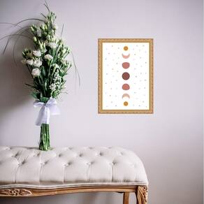 Quadro moldura dourada fases lua boho 33x24cm Acabamento: com acetato Informações do produto tire todas as suas dúvidas no descritivo abaixo: decoração para quarto, sala, cozinha, escritório, área gourmet e muito mais. Chega de paredes vazias medidas - cada peça tem 33x24cm a4 . Material do papel - papel fotográfico brilhante de altíssima resolução acabamento - todos os quadros são acompanhados de vidro ou uma película de acetato para proteção da imagem conforme escolha . - os quadros são embalados de forma segura com plástico bolha com camada dupla de acordo com o tamanho dos quadros. Garantia - garantia de 3 meses. Meu quadro chegou. Como posso fixá-lo Você precisa apenas de um martelo e um prego, pois os quadros já vão acompanhados de penduradores. Esta é a forma mais indicada. Caso prefira, você pode utilizar uma fita dupla face neste caso, sugerimos de alta qualidade para evitar que descole e seu quadro caia . Como posso limpar meu quadro A limpeza é feita como um móvel comum da sua casa. Apenas um pano seco ou espanador são suficientes para tal
