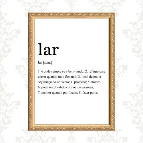 Quadro moldura dourada lar significado 33x24cm Acabamento: com acetato Informações do produto tire todas as suas dúvidas no descritivo abaixo: decoração para quarto, sala, cozinha, escritório, área gourmet e muito mais. Chega de paredes vazias medidas - cada peça tem 33x24cm a4 . Material do papel - papel fotográfico brilhante de altíssima resolução acabamento - todos os quadros são acompanhados de vidro ou uma película de acetato para proteção da imagem conforme escolha . - os quadros são embalados de forma segura com plástico bolha com camada dupla de acordo com o tamanho dos quadros. - de 3 meses. Meu quadro chegou. Como posso fixá-lo Você precisa apenas de um martelo e um prego, pois os quadros já vão acompanhados de penduradores. Esta é a forma mais indicada. Caso prefira, você pode utilizar uma fita dupla face neste caso, sugerimos de alta qualidade para evitar que descole e seu quadro caia . Como posso limpar meu quadro A limpeza é feita como um móvel comum da sua casa. Apenas um pano seco ou espanador são suficientes para tal Marca: Não Informado Ean: 7892797861727