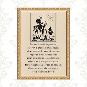 Quadro moldura dourada lema de dom quixote 24x18cm Acabamento: com vidro Informações do produto tire todas as suas dúvidas no descritivo abaixo: decoração para quarto, sala, cozinha, escritório, área gourmet e muito mais. Chega de paredes vazias medidas - cada peça tem 24x18cm a5 . Material do papel - papel fotográfico brilhante de altíssima resolução acabamento - todos os quadros são acompanhados de vidro ou uma película de acetato para proteção da imagem conforme escolha . - os quadros são embalados de forma segura com plástico bolha com camada dupla de acordo com o tamanho dos quadros. Garantia - garantia de 3 meses. Meu quadro chegou. Como posso fixá-lo Você precisa apenas de um martelo e um prego, pois os quadros já vão acompanhados de penduradores. Esta é a forma mais indicada. Caso prefira, você pode utilizar uma fita dupla face neste caso, sugerimos de alta qualidade para evitar que descole e seu quadro caia . Como posso limpar meu quadro A limpeza é feita como um móvel comum da sua casa. Apenas um pano seco ou espanador são suficientes para tal