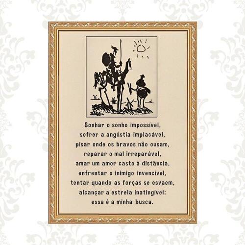 Quadro moldura dourada lema de dom quixote 45x34cm Acabamento: com vidro Informações do produto tire todas as suas dúvidas no descritivo abaixo: decoração para quarto, sala, cozinha, escritório, área gourmet e muito mais. Chega de paredes vazias. Medidas - cada peça tem 45x34cm a3 . Material do papel - papel fotográfico brilhante de altíssima resolução acabamento - todos os quadros são acompanhados de vidro ou uma película de acetato para proteção da imagem conforme escolha . - os quadros são embalados de forma segura com plástico bolha com camada dupla de acordo com o tamanho dos quadros. Garantia - garantia de 3 meses. Meu quadro chegou. Como posso fixá-lo Você precisa apenas de um martelo e um prego, pois os quadros já vão acompanhados de penduradores. Esta é a forma mais indicada. Caso prefira, você pode utilizar uma fita dupla face neste caso, sugerimos de alta qualidade para evitar que descole e seu quadro caia . Como posso limpar meu quadro A limpeza é feita como um móvel comum da sua casa. Apenas um pano seco ou espanador são suficientes para tal