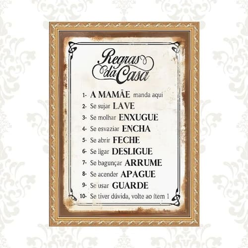 Quadro moldura dourada regras da casa 45x34cm Acabamento: com acetato Informações do produto tire todas as suas dúvidas no descritivo abaixo: decoração para quarto, sala, cozinha, escritório, área gourmet e muito mais. Chega de paredes vazias. Medidas - cada peça tem 45x34cm a3 . Material do papel - papel fotográfico brilhante de altíssima resolução acabamento - todos os quadros são acompanhados de vidro ou uma película de acetato para proteção da imagem conforme escolha . - os quadros são embalados de forma segura com plástico bolha com camada dupla de acordo com o tamanho dos quadros. Garantia - garantia de 3 meses. Meu quadro chegou. Como posso fixá-lo Você precisa apenas de um martelo e um prego, pois os quadros já vão acompanhados de penduradores. Esta é a forma mais indicada. Caso prefira, você pode utilizar uma fita dupla face neste caso, sugerimos de alta qualidade para evitar que descole e seu quadro caia . Como posso limpar meu quadro A limpeza é feita como um móvel comum da sua casa. Apenas um pano seco ou espanador são suficientes para tal