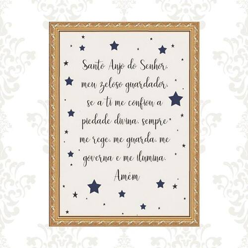 Quadro moldura dourada santo anjo estrelinhas 33x24cm Acabamento: com vidro Informações do produto tire todas as suas dúvidas no descritivo abaixo: decoração para quarto, sala, cozinha, escritório, área gourmet e muito mais. Chega de paredes vazias medidas - cada peça tem 33x24cm a4 . Material do papel - papel fotográfico brilhante de altíssima resolução acabamento - todos os quadros são acompanhados de vidro ou uma película de acetato para proteção da imagem conforme escolha . - os quadros são embalados de forma segura com plástico bolha com camada dupla de acordo com o tamanho dos quadros. - de 3 meses. Meu quadro chegou. Como posso fixá-lo Você precisa apenas de um martelo e um prego, pois os quadros já vão acompanhados de penduradores. Esta é a forma mais indicada. Caso prefira, você pode utilizar uma fita dupla face neste caso, sugerimos de alta qualidade para evitar que descole e seu quadro caia . Como posso limpar meu quadro A limpeza é feita como um móvel comum da sua casa. Apenas um pano seco ou espanador são suficientes para tal Marca: Não Informado Ean: 7894502689589