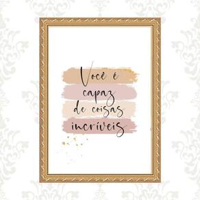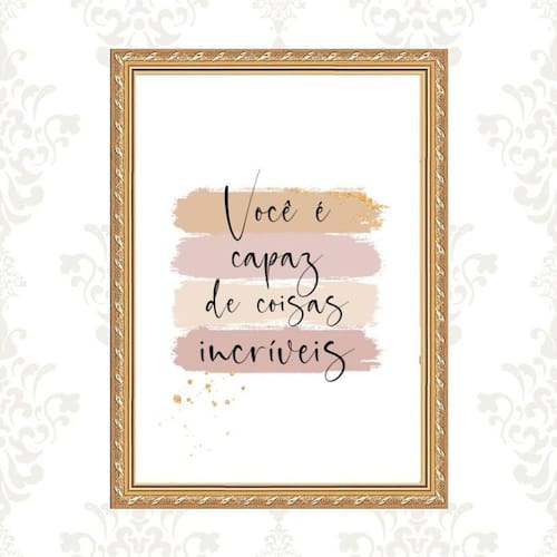 Quadro moldura dourada você é capaz 24x18cm Acabamento: com vidro Informações do produto tire todas as suas dúvidas no descritivo abaixo: decoração para quarto, sala, cozinha, escritório, área gourmet e muito mais. Chega de paredes vazias medidas - cada peça tem 24x18cm a5 . Material do papel - papel fotográfico brilhante de altíssima resolução acabamento - todos os quadros são acompanhados de vidro ou uma película de acetato para proteção da imagem conforme escolha . - os quadros são embalados de forma segura com plástico bolha com camada dupla de acordo com o tamanho dos quadros. - de 3 meses. Meu quadro chegou. Como posso fixá-lo Você precisa apenas de um martelo e um prego, pois os quadros já vão acompanhados de penduradores. Esta é a forma mais indicada. Caso prefira, você pode utilizar uma fita dupla face neste caso, sugerimos de alta qualidade para evitar que descole e seu quadro caia . Como posso limpar meu quadro A limpeza é feita como um móvel comum da sua casa. Apenas um pano seco ou espanador são suficientes para tal Marca: Não Informado