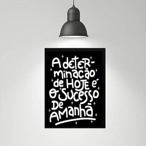 Quadro motivacional determinação sucesso 24x18cm - com vidro Moldura: madeira branca Informações do produto tire todas as suas dúvidas no descritivo abaixo: decoração para quarto, sala, cozinha, escritório, área gourmet e muito mais. Chega de paredes vazias medidas - cada peça tem 24x18cm a5 . Material do papel - papel fotográfico brilhante de altíssima resolução acabamento - todos os quadros são acompanhados de vidro para proteção da imagem. - moldura em madeira maciça na cor preta ou branca conforme produto escolhido e pendurador . - os quadros são embalados de forma segura com plástico bolha com camada dupla de acordo com o tamanho dos quadros. Garantia - garantia de 3 meses. Meu quadro chegou. Como posso fixá-lo Você precisa apenas de um martelo e um prego, pois os quadros já vão acompanhados de penduradores. Esta é a forma mais indicada. Como posso limpar meu quadro A limpeza é feita como um móvel comum da sua casa. Apenas um pano seco ou espanador são suficientes para tal