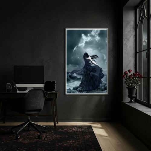 Quadro Mulher Vestido Preto à Beira-Mar na Noite - 70x50cm - Cor: Moldura Preta