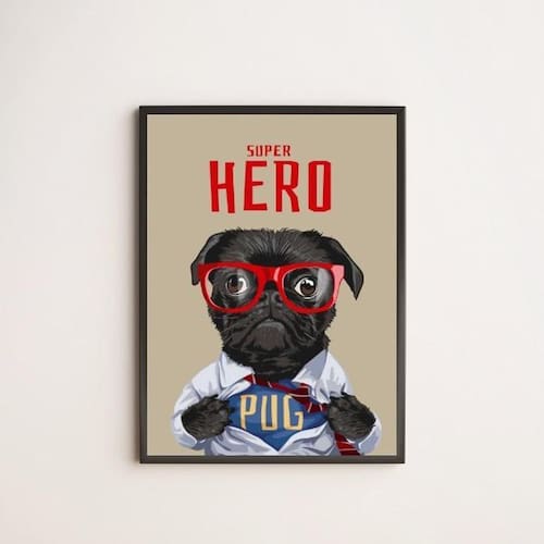Quadro my super hero pug 33x24cm - com vidro Moldura: madeira branca Informações do produto tire todas as suas dúvidas no descritivo abaixo: decoração para quarto, sala, cozinha, escritório, área gourmet e muito mais. Chega de paredes vazias medidas - cada peça tem 33x24cm a4 . Material do papel - papel fotográfico brilhante de altíssima resolução acabamento - todos os quadros são acompanhados de vidro para proteção da imagem. - moldura em madeira maciça na cor preta e pendurador . - os quadros são embalados de forma segura com plástico bolha com camada dupla de acordo com o tamanho dos quadros. - de 3 meses. Meu quadro chegou. Como posso fixá-lo Você precisa apenas de um martelo e um prego, pois os quadros já vão acompanhados de penduradores. Esta é a forma mais indicada. Como posso limpar meu quadro A limpeza é feita como um móvel comum da sua casa. Apenas um pano seco ou espanador são suficientes para tal Ean: 7895142246132