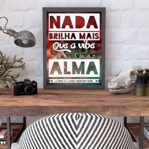Quadro nada brilha mais que a alma 33x24cm - com vidro Moldura: madeira preta Informações do produto tire todas as suas dúvidas no descritivo abaixo: decoração para quarto, sala, cozinha, escritório, área gourmet e muito mais. Chega de paredes vazias medidas - cada peça tem 33x24cm a4 . Material do papel - papel fotográfico brilhante de altíssima resolução acabamento - todos os quadros são acompanhados de vidro para proteção da imagem. - moldura em madeira maciça na cor preta ou branca conforme produto escolhido e pendurador . - os quadros são embalados de forma segura com plástico bolha com camada dupla de acordo com o tamanho dos quadros. Garantia - garantia de 3 meses. Meu quadro chegou. Como posso fixá-lo Você precisa apenas de um martelo e um prego, pois os quadros já vão acompanhados de penduradores. Esta é a forma mais indicada. Como posso limpar meu quadro A limpeza é feita como um móvel comum da sua casa. Apenas um pano seco ou espanador são suficientes para tal