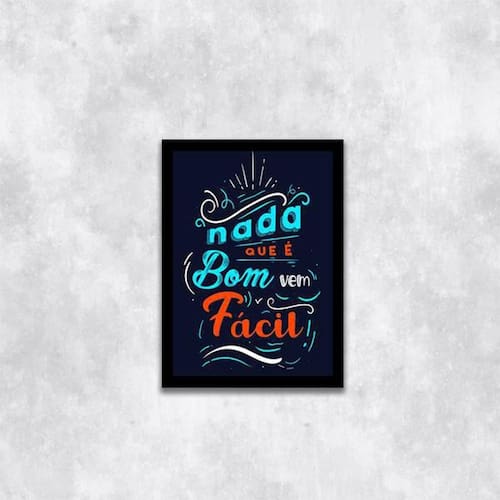 Quadro nada que é bom vem fácil 24x18cm Moldura: madeira preta Informações do produto tire todas as suas dúvidas no descritivo abaixo: decoração para quarto, sala, cozinha, escritório, área gourmet e muito mais. Chega de paredes vazias medidas - cada peça tem 24x18cm a5 . Material do papel - papel fotográfico brilhante de altíssima resolução acabamento - todos os quadros são acompanhados de uma película de acetato para proteção da imagem. - moldura em madeira maciça na cor branca e pendurador móvel que pode ser retirado facilmente caso deseje fixar com fita dupla face. - os quadros são embalados de forma segura com plástico bolha com camada dupla de acordo com o tamanho dos quadros. - de 3 meses prazo de envio pedimos 24 horas úteis no máximo para enviar seu pedido após o envio, segue os prazos normais dos correios, cerca de 7 exceto para norte e nordeste, que pode ser de até 14 . Em diversas cidades, este prazo normalmente é reduzido, mas depende do prazo dos correios. Meu quadro chegou. Como posso fixá-lo Você precisa apenas de um martelo e um prego, pois os quadros já vão acompanhados de penduradores. Esta é a forma mais indicada. Caso prefira, você pode utilizar uma fita dupla face neste caso, sugerimos de alta qualidade para evitar que descole e seu quadro caia . Como posso limpar meu quadro A limpeza é feita como um móvel comum da sua casa. Apenas um pano seco ou espanador são suficientes para tal