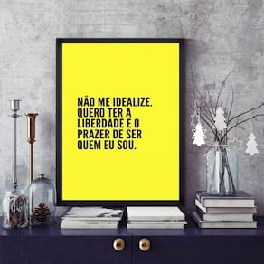 Quadro não me idealize 45x34cm - com vidro Cor: moldura branca Informações do produto tire todas as suas dúvidas no descritivo abaixo: decoração para quarto, sala, cozinha, escritório, área gourmet e muito mais. Chega de paredes vazias medidas - cada peça tem 45x34cm a3 . Material do papel - papel fotográfico brilhante de altíssima resolução acabamento - todos os quadros são acompanhados de vidro para proteção da imagem. - moldura em madeira maciça na cor preta ou branca conforme produto escolhido e pendurador . - os quadros são embalados de forma segura com plástico bolha com camada dupla de acordo com o tamanho dos quadros. Garantia - garantia de 3 meses. Meu quadro chegou. Como posso fixá-lo Você precisa apenas de um martelo e um prego, pois os quadros já vão acompanhados de penduradores. Esta é a forma mais indicada. Como posso limpar meu quadro A limpeza é feita como um móvel comum da sua casa. Apenas um pano seco ou espanador são suficientes para tal