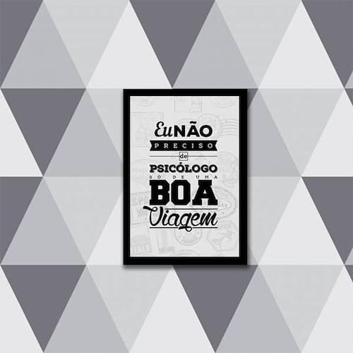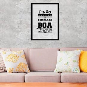 Quadro não preciso psicólogo, só de viagem 33x24cm - com vidro Moldura: madeira preta Informações do produto tire todas as suas dúvidas no descritivo abaixo: decoração para quarto, sala, cozinha, escritório, área gourmet e muito mais. Chega de paredes vazias medidas - cada peça tem 33x24cm a4 . Material do papel - papel fotográfico brilhante de altíssima resolução acabamento - todos os quadros são acompanhados de vidro para proteção da imagem. - moldura em madeira maciça na cor preta e pendurador . - os quadros são embalados de forma segura com plástico bolha com camada dupla de acordo com o tamanho dos quadros. - de 3 meses. Meu quadro chegou. Como posso fixá-lo Você precisa apenas de um martelo e um prego, pois os quadros já vão acompanhados de penduradores. Esta é a forma mais indicada. Como posso limpar meu quadro A limpeza é feita como um móvel comum da sua casa. Apenas um pano seco ou espanador são suficientes para tal Marca: Não Informado