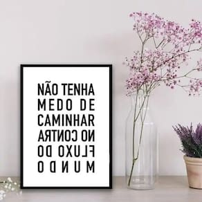 Quadro não tenha medo de caminhar no contra fluxo 24x18cm - com vidro Moldura: madeira preta Informações do produto tire todas as suas dúvidas no descritivo abaixo: decoração para quarto, sala, cozinha, escritório, área gourmet e muito mais. Chega de paredes vazias medidas - cada peça tem 24x18cm a5 . Material do papel - papel fotográfico brilhante de altíssima resolução acabamento - todos os quadros são acompanhados de vidro para proteção da imagem. - moldura em madeira maciça na cor preta e pendurador . - os quadros são embalados de forma segura com plástico bolha com camada dupla de acordo com o tamanho dos quadros. Garantia - garantia de 3 meses. Meu quadro chegou. Como posso fixá-lo Você precisa apenas de um martelo e um prego, pois os quadros já vão acompanhados de penduradores. Esta é a forma mais indicada. Como posso limpar meu quadro A limpeza é feita como um móvel comum da sua casa. Apenas um pano seco ou espanador são suficientes para tal