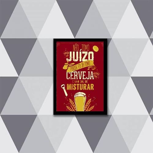 Quadro não tomo juízo, tomo cerveja 24x18cm Moldura: madeira preta Informações do produto tire todas as suas dúvidas no descritivo abaixo: decoração para quarto, sala, cozinha, escritório, área gourmet e muito mais. Chega de paredes vazias medidas - cada peça tem 24x18cm a5 . Material do papel - papel fotográfico brilhante de altíssima resolução acabamento - todos os quadros são acompanhados de uma película de acetato para proteção da imagem. - moldura em madeira maciça na cor branca e pendurador móvel que pode ser retirado facilmente caso deseje fixar com fita dupla face. - os quadros são embalados de forma segura com plástico bolha com camada dupla de acordo com o tamanho dos quadros. - de 3 meses prazo de envio pedimos 24 horas úteis no máximo para enviar seu pedido após o envio, segue os prazos normais dos correios, cerca de 7 exceto para norte e nordeste, que pode ser de até 14 . Em diversas cidades, este prazo normalmente é reduzido, mas depende do prazo dos correios. Meu quadro chegou. Como posso fixá-lo Você precisa apenas de um martelo e um prego, pois os quadros já vão acompanhados de penduradores. Esta é a forma mais indicada. Caso prefira, você pode utilizar uma fita dupla face neste caso, sugerimos de alta qualidade para evitar que descole e seu quadro caia . Como posso limpar meu quadro A limpeza é feita como um móvel comum da sua casa. Apenas um pano seco ou espanador são suficientes para tal