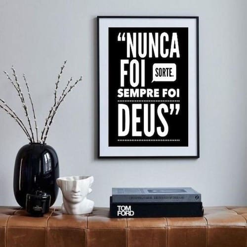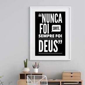 Quadro nunca foi sorte sempre foi deus - 60x48cm Moldura: madeira preta Informações do produto tire todas as suas dúvidas no descritivo abaixo: decoração para quarto, sala, cozinha, escritório, área gourmet e muito mais. Chega de paredes vazias medidas - cada peça tem 60x48cm . Material do papel - papel fotográfico brilhante de altíssima resolução acabamento - todos os quadros são acompanhados de vidro para proteção da imagem. - moldura em madeira maciça na cor preta ou branca conforme produto escolhido e pendurador. - paspatur branco com 7cm de largura - os quadros são embalados de forma segura com plástico bolha com camada dupla de acordo com o tamanho dos quadros. Garantia - garantia de 3 meses. Meu quadro chegou. Como posso fixá-lo Você precisa apenas de um martelo e um prego, pois os quadros já vão acompanhados de penduradores. Esta é a forma mais indicada. Como posso limpar meu quadro A limpeza é feita como um móvel comum da sua casa. Apenas um pano seco ou espanador são suficientes para tal