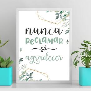 Quadro nunca reclamar só agradecer 24x18cm Cor: moldura preta Informações do produto tire todas as suas dúvidas no descritivo abaixo: decoração para quarto, sala, cozinha, escritório, área gourmet e muito mais. Chega de paredes vazias medidas - cada peça tem 24x18cm a5 . Material do papel - papel fotográfico brilhante de altíssima resolução acabamento - todos os quadros são acompanhados de uma película de acetato para proteção da imagem. - os quadros são embalados de forma segura com plástico bolha com camada dupla de acordo com o tamanho dos quadros. - de 3 meses. Meu quadro chegou. Como posso fixá-lo Você precisa apenas de um martelo e um prego, pois os quadros já vão acompanhados de penduradores. Esta é a forma mais indicada. Caso prefira, você pode utilizar uma fita dupla face neste caso, sugerimos de alta qualidade para evitar que descole e seu quadro caia . Como posso limpar meu quadro A limpeza é feita como um móvel comum da sua casa. Apenas um pano seco ou espanador são suficientes para tal Marca: Não Informado
