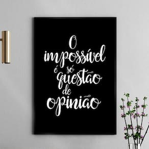 Quadro o impossível é só questão de opinião 24x18cm - com vidro Moldura: madeira branca Informações do produto tire todas as suas dúvidas no descritivo abaixo: decoração para quarto, sala, cozinha, escritório, área gourmet e muito mais. Chega de paredes vazias medidas - cada peça tem 24x18cm a5 . Material do papel - papel fotográfico brilhante de altíssima resolução acabamento - todos os quadros são acompanhados de vidro para proteção da imagem. - moldura em madeira maciça na cor preta ou branca conforme produto escolhido e pendurador . - os quadros são embalados de forma segura com plástico bolha com camada dupla de acordo com o tamanho dos quadros. - de 3 meses. Meu quadro chegou. Como posso fixá-lo Você precisa apenas de um martelo e um prego, pois os quadros já vão acompanhados de penduradores. Esta é a forma mais indicada. Como posso limpar meu quadro A limpeza é feita como um móvel comum da sua casa. Apenas um pano seco ou espanador são suficientes para tal Marca: Não Informado Ean: 7895564895048