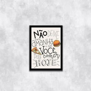 Quadro o que você pode comer hoje 45x34cm - com vidro Moldura: madeira preta Informações do produto tire todas as suas dúvidas no descritivo abaixo: decoração para quarto, sala, cozinha, escritório, área gourmet e muito mais. Chega de paredes vazias medidas - cada peça tem 45x34cm a3 . Material do papel - papel fotográfico brilhante de altíssima resolução acabamento - todos os quadros são acompanhados de vidro para proteção da imagem. - moldura em madeira maciça na cor preta e pendurador . - os quadros são embalados de forma segura com plástico bolha com camada dupla de acordo com o tamanho dos quadros. Garantia - garantia de 3 meses. Meu quadro chegou. Como posso fixá-lo Você precisa apenas de um martelo e um prego, pois os quadros já vão acompanhados de penduradores. Esta é a forma mais indicada. Como posso limpar meu quadro A limpeza é feita como um móvel comum da sua casa. Apenas um pano seco ou espanador são suficientes para tal