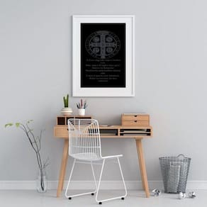 Quadro oração de são bento preto e branco - 60x48cm Moldura: madeira branca Informações do produto tire todas as suas dúvidas no descritivo abaixo: decoração para quarto, sala, cozinha, escritório, área gourmet e muito mais. Chega de paredes vazias medidas - cada peça tem 60x48cm . Material do papel - papel fotográfico brilhante de altíssima resolução acabamento - todos os quadros são acompanhados de vidro para proteção da imagem. - moldura em madeira maciça na cor preta ou branca conforme produto escolhido e pendurador. - paspatur branco com 7cm de largura - os quadros são embalados de forma segura com plástico bolha com camada dupla de acordo com o tamanho dos quadros. Garantia - garantia de 3 meses. Meu quadro chegou. Como posso fixá-lo Você precisa apenas de um martelo e um prego, pois os quadros já vão acompanhados de penduradores. Esta é a forma mais indicada. Como posso limpar meu quadro A limpeza é feita como um móvel comum da sua casa. Apenas um pano seco ou espanador são suficientes para tal Ean: 7894460757948