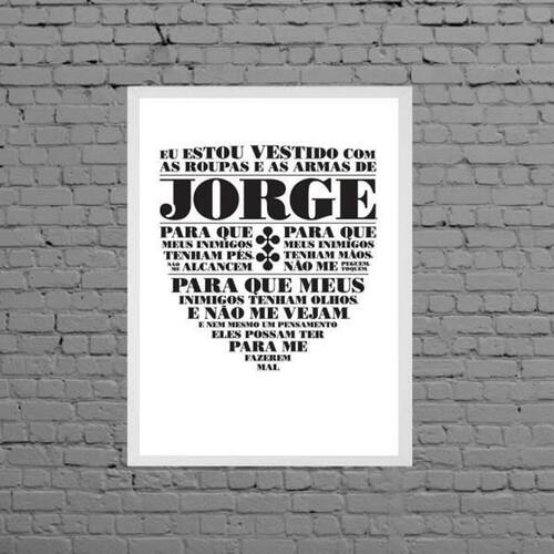 Quadro oração de são jorge 45x34cm - com vidro Moldura: madeira branca Informações do produto tire todas as suas dúvidas no descritivo abaixo: decoração para quarto, sala, cozinha, escritório, área gourmet e muito mais. Chega de paredes vazias medidas - cada peça tem 45x34cm a3 . Material do papel - papel fotográfico brilhante de altíssima resolução acabamento - todos os quadros são acompanhados de vidro para proteção da imagem. - moldura em madeira maciça na cor preta e pendurador . - os quadros são embalados de forma segura com plástico bolha com camada dupla de acordo com o tamanho dos quadros. Garantia - garantia de 3 meses. Meu quadro chegou. Como posso fixá-lo Você precisa apenas de um martelo e um prego, pois os quadros já vão acompanhados de penduradores. Esta é a forma mais indicada. Como posso limpar meu quadro A limpeza é feita como um móvel comum da sua casa. Apenas um pano seco ou espanador são suficientes para tal