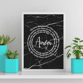 Quadro oração pai nosso fundo mármore 45x34cm - com vidro Moldura: madeira branca Informações do produto tire todas as suas dúvidas no descritivo abaixo: decoração para quarto, sala, cozinha, escritório, área gourmet e muito mais. Chega de paredes vazias medidas - cada peça tem 45x34cm a3 . Material do papel - papel fotográfico brilhante de altíssima resolução acabamento - todos os quadros são acompanhados de vidro para proteção da imagem. - moldura em madeira maciça na cor preta ou branca conforme produto escolhido e pendurador . - os quadros são embalados de forma segura com plástico bolha com camada dupla de acordo com o tamanho dos quadros. Garantia - garantia de 3 meses. Meu quadro chegou. Como posso fixá-lo Você precisa apenas de um martelo e um prego, pois os quadros já vão acompanhados de penduradores. Esta é a forma mais indicada. Como posso limpar meu quadro A limpeza é feita como um móvel comum da sua casa. Apenas um pano seco ou espanador são suficientes para tal Ean: 7895516639980