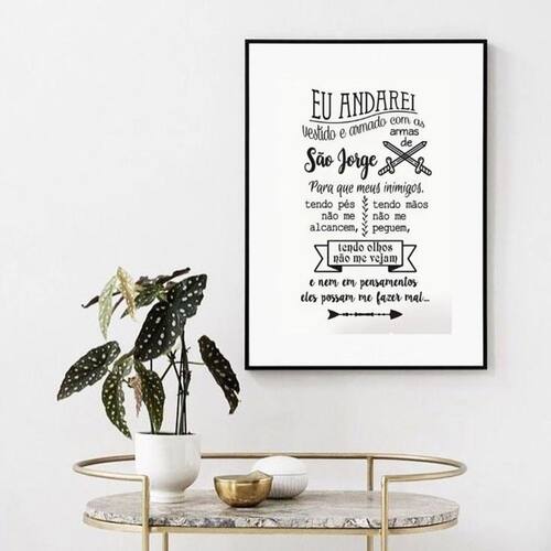 Quadro oração para são jorge - 60x48cm Cor: moldura branca Informações do produto tire todas as suas dúvidas no descritivo abaixo: decoração para quarto, sala, cozinha, escritório, área gourmet e muito mais. Chega de paredes vazias medidas - cada peça tem 60x48cm . Material do papel - papel fotográfico brilhante de altíssima resolução acabamento - todos os quadros são acompanhados de vidro para proteção da imagem. - moldura em madeira maciça na cor preta ou branca conforme produto escolhido e pendurador. - paspatur branco com 7cm de largura - os quadros são embalados de forma segura com plástico bolha com camada dupla de acordo com o tamanho dos quadros. Garantia - garantia de 3 meses. Meu quadro chegou. Como posso fixá-lo Você precisa apenas de um martelo e um prego, pois os quadros já vão acompanhados de penduradores. Esta é a forma mais indicada. Como posso limpar meu quadro A limpeza é feita como um móvel comum da sua casa. Apenas um pano seco ou espanador são suficientes para tal Ean: 7891234528940