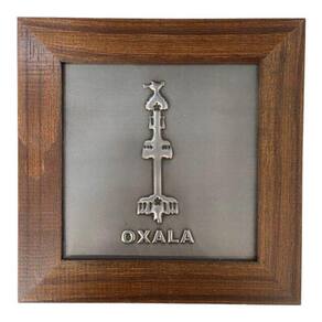 Feito com madeira de imbuia e aço, este quadro de 18 x18 cm é uma obra de arte única que celebra a energia poderosa deste importante orixá.