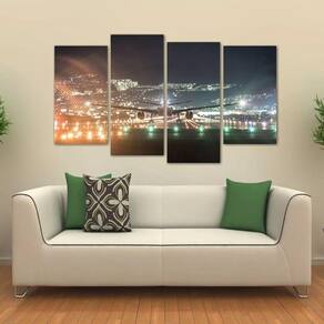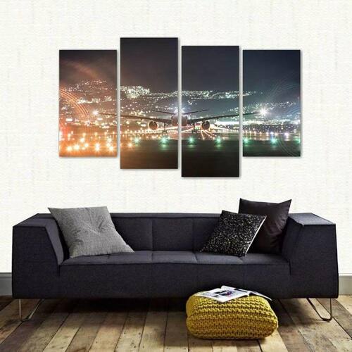 Quadro Paisagem Noturna Avião Escritório Em Tecido 4 Peças